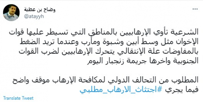 دعا الكاتب الصحفي وضاح بن عطية، اليوم، التحالف الدولي لمكافحة الإرهاب إلى اتخاذ موقف واضح من ممارسات الشرعية الإخوانية التي تأوي الإرهابيين بالمناطق التي تسيطر عليها.