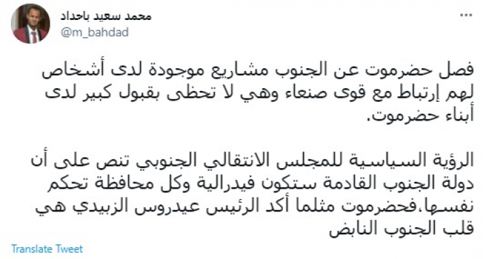 وقال في تغريدة عبر "تويتر" رصدها "المشهد العربي": "فصل حضرموت عن الجنوب مشاريع موجودة لدى أشخاص لهم إرتباط مع قوى صنعاء وهي لا تحظى بقبول كبير لدى أبناء حضرموت".