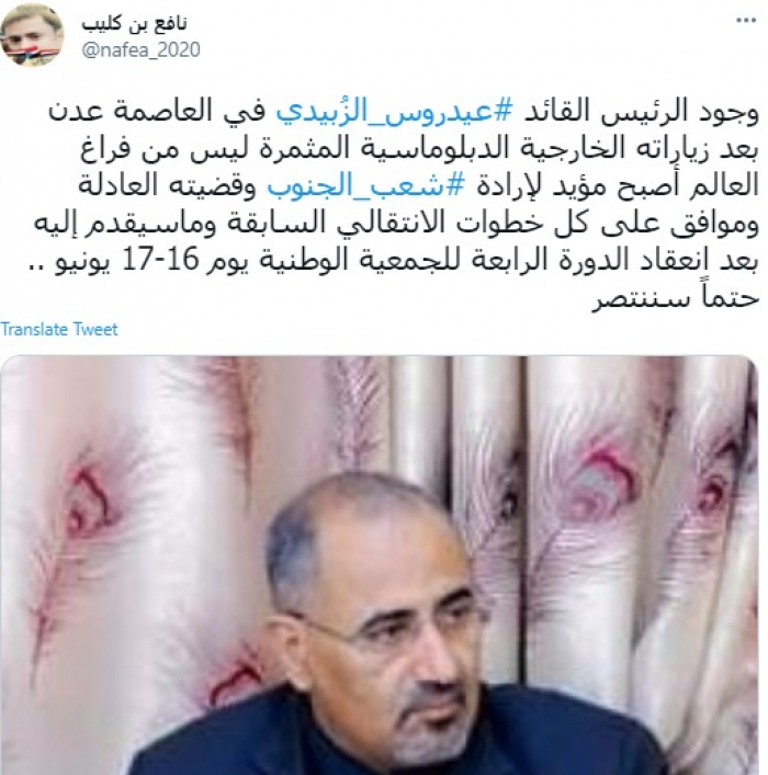 وتابع: "العالم أصبح مؤيدًا لإرادة شعب الجنوب وقضيته العادلة وموافقًا على كل خطوات الانتقالي السابقة وما سيقدم إليه بعد انعقاد الدورة الرابعة للجمعية الوطنية يومي 16و17 يونيو .. حتمًا سننتصر".