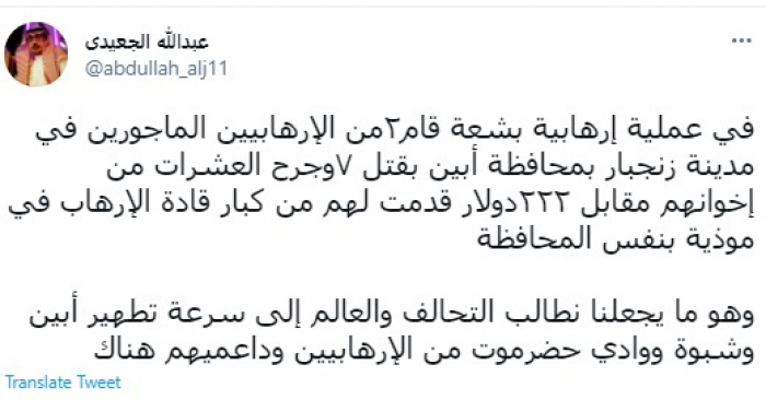 وقال في تغريدة عبر "تويتر" رصدها "المشهد العربي": "في عملية إرهابية بشعة قام 2 من الإرهابيين المأجورين في مدينة زنجبار بمحافظة أبين بقتل 7 وجرح العشرات من إخوانهم مقابل 222 دولار قدمت لهم من كبار قادة الإرهاب في مودية بنفس المحافظة".