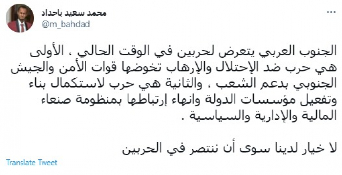 قال الناشط السياسي محمد سعيد باحداد، اليوم، إن الجنوب العربي يتعرض لحربين خلال الفترة الحالية، مشددًا على أنه لا خيار سوى الانتصار في تلك الحروب.