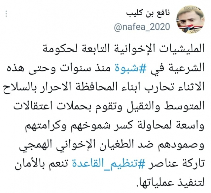 وشدد على أنها: "تقوم بحملات اعتقالات واسعة لمحاولة كسر شموخهم وكرامتهم وصمودهم ضد الطغيان الإخواني الهمجي تاركة عناصر تنظيم القاعدة تنعم بالأمان لتنفيذ عملياتها".
