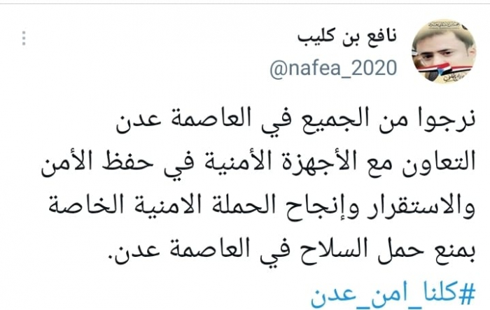 وقال في تغريدة على حسابه بموقع التدوين المصغر تويتر، اليوم إننا: "نرجو من الجميع في العاصمة عدن التعاون مع الأجهزة الأمنية في حفظ الأمن والاستقرار وإنجاح الحملة الأمنية الخاصة بمنع حمل السلاح في العاصمة عدن"، مختتما بهاشتاج: "كلنا أمن عدن".