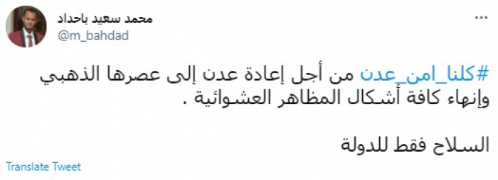 وقال في تغريدة عبر "تويتر" رصدها "المشهد العربي": "كلنا أمن عدن من أجل إعادة عدن إلى عصرها الذهبي وإنهاء كافة أشكال المظاهر العشوائية".