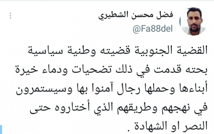وأشار في تغريدة على حسابه بموقع التدوين المصغر تويتر، اليوم إلى أن: "القضية الجنوبية قضية وطنية سياسية بحته قدمت في ذلك تضحيات ودماء خيرة أبناءها وحملها رجال آمنوا بها".