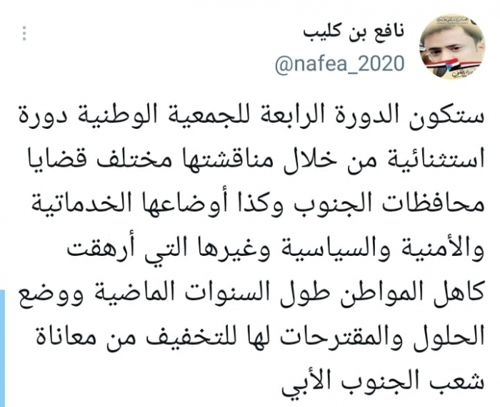 ورأى في تغريدة على حسابه بموقع التدوين المصغر تويتر، اليوم أنه: "ستكون الدورة الرابعة للجمعية الوطنية دورة استثنائية من خلال مناقشتها مختلف قضايا محافظات الجنوب".