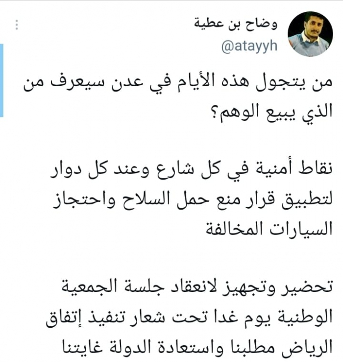 وشدد في تغريدة على حسابه بموقع التدوين المصغر تويتر، اليوم على أن: "من يتجول هذه الأيام في عدن سيعرف من الذي يبيع الوهم".