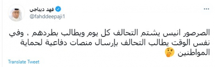 وقال في تغريدة عبر "تويتر" رصدها "المشهد العربي": "الصرصور أنيس يشتم التحالف كل يوم ويطالب بطردهم، وفي نفس الوقت يطالب التحالف بإرسال منصات دفاعية لحماية المواطنين".