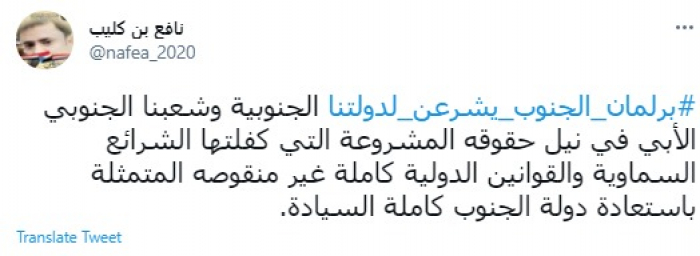 قال الناشط السياسي نافع بن كليب، اليوم، إن برلمان الجنوب يُشرع لاستعادة الدولة الجنوبية وحقوق الشعب المشروعة.