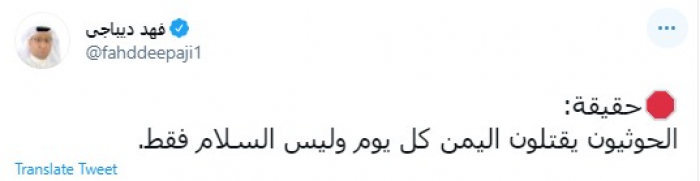 وكتب في تغريدة عبر "تويتر" رصدها "المشهد العربي": "حقيقة: الحوثيون يقتلون اليمن كل يوم وليس السلام فقط".