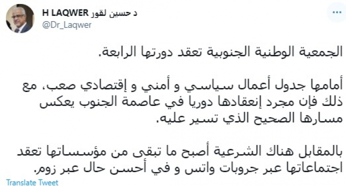 وقال في تغريدة عبر "تويتر" رصدها "المشهد العربي": "الجمعية الوطنية الجنوبية تعقد دورتها الرابعة".