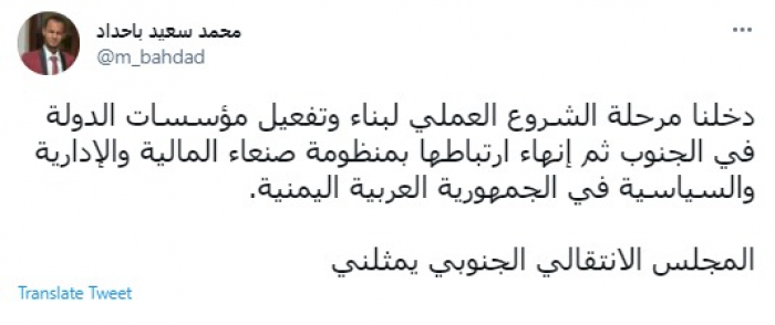 وكتب في تغريدة عبر "تويتر" رصدها "المشهد العربي": "دخلنا مرحلة الشروع العملي لبناء وتفعيل مؤسسات الدولة في الجنوب ثم إنهاء ارتباطها بمنظومة صنعاء المالية والإدارية والسياسية في الجمهورية العربية اليمنية".