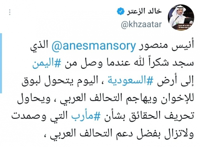 وحذر من أنه: "يهاجم التحالف العربي ، ويحاول تحريف الحقائق بشأن مأرب التي صمدت ولاتزال بفضل دعم التحالف العربي".