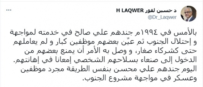 ولفت في تغريدة على حسابه بتويتر، إلى أنهم: "بالأمس في 1994م جندهم علي صالح في خدمته لمواجهة واحتلال الجنوب ثم عُين بعضهم موظفين كبار ولم يعاملهم حتى كشركاء صغار".