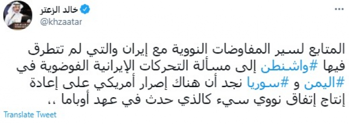وكتب في تغريدة عبر "تويتر" رصدها "المشهد العربي": "المتابع لسير المفاوضات النووية مع إيران والتي لم تتطرق فيها واشنطن إلى مسألة التحركات الإيرانية الفوضوية في اليمن وسوريا".