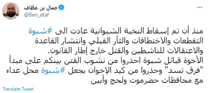 وتابع: "الأخوة قبائل شبوة احذروا من نشوب الفتن بينكم على مبدأ فرق تسد وحذروا من كيد الإخوان بجعل شبوة محل عداء مع محافظات حضرموت ولحج وأبين".