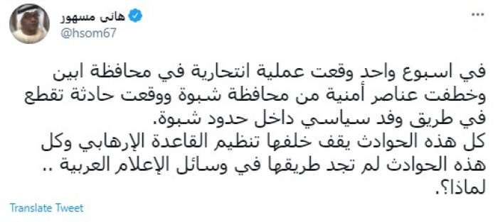 وقال في تغريدة عبر "تويتر" رصدها "المشهد العربي": "في أسبوع واحد وقعت عملية انتحارية في محافظة أبين وخطفت عناصر أمنية من محافظة شبوة ووقعت حادثة تقطع في طريق وفد سياسي داخل حدود شبوة".