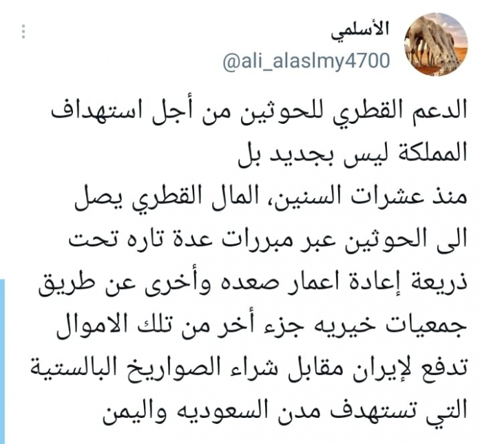حذر الناشط السياسي علي الأسلمي، من استمرار تدفق التمويل القطري على مليشيا الحوثي الإرهابية، لاستهداف السعودية، بذريعة إعادة الإعمار.