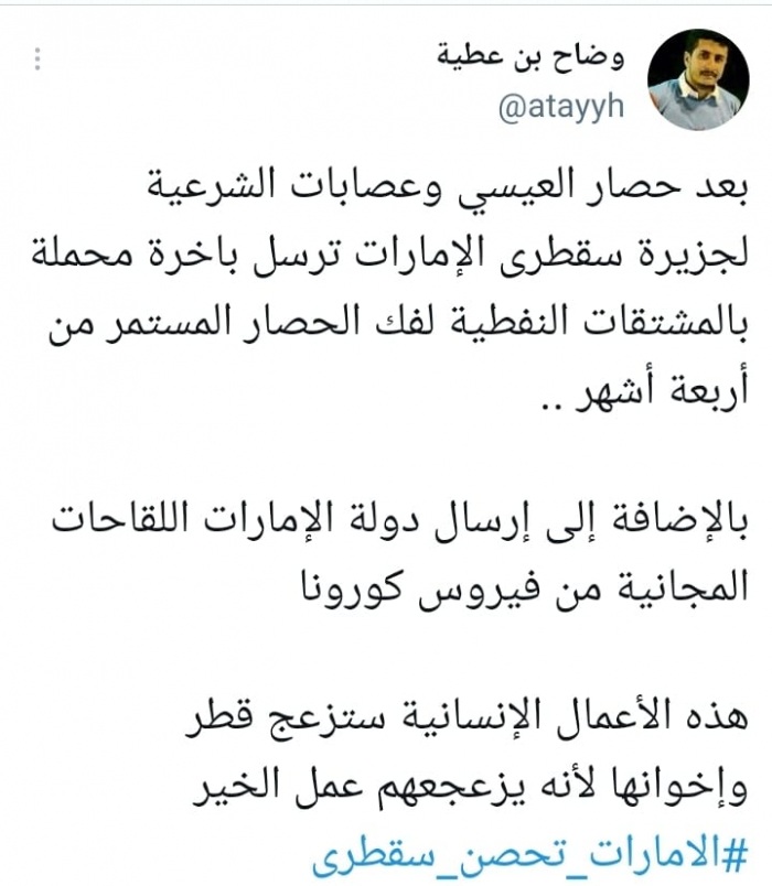 وتابع: "بالإضافة إلى إرسال دولة الإمارات اللقاحات المجانية من فيروس كورونا، هذه الأعمال الإنسانية ستزعج قطر وإخوانها لأنه يزعجهم عمل الخير"، مختتما بهاشتاج: "الإمارات تحصن سقطرى".