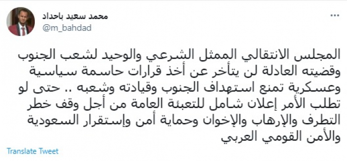 وكتب في تغريدة عبر "تويتر" رصدها "المشهد العربي": "المجلس الانتقالي الممثل الشرعي والوحيد لشعب الجنوب وقضيته العادلة لن يتأخر عن أخذ قرارات حاسمة سياسية وعسكرية تمنع استهداف الجنوب وقيادته وشعبه".