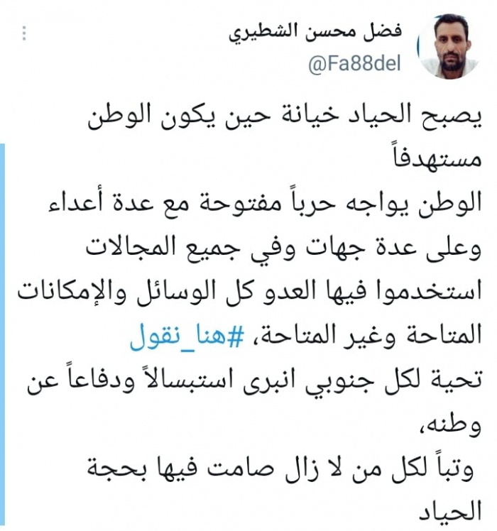 وتابع:"هنا نقول تحية لكل جنوبي انبرى استبسالا ودفاعا عن وطنه، وتبا لكل من لا زال صامت فيها بحجة الحياد".
