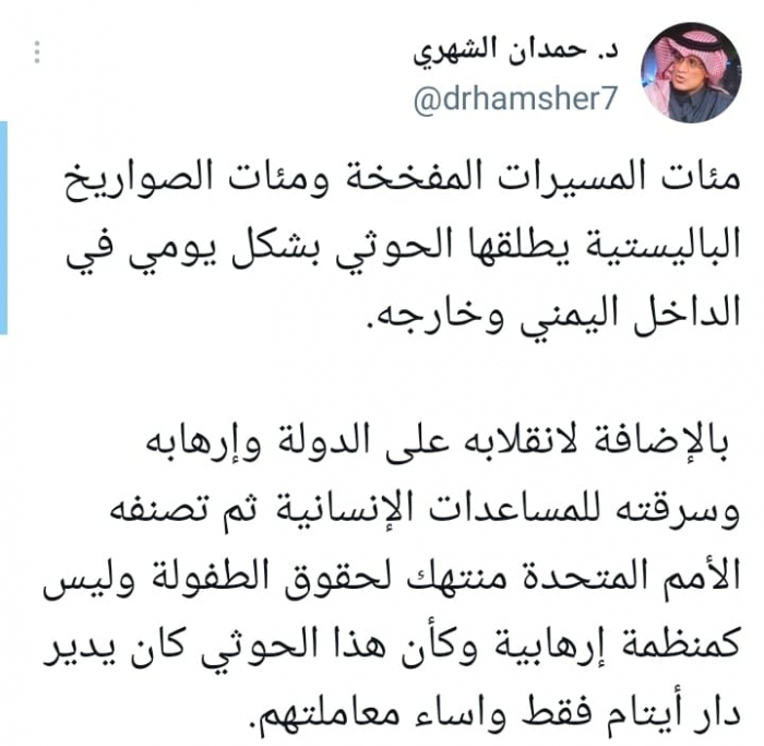 استنكر الباحث السياسي الدكتور حمدان الشهري، تباطؤ الأمم المتحدة في تصنيف مليشيا الحوثي على قوائم المنظمات الإرهابية، على الرغم من إطلاقها طائرات بدون طيار تجاه السعودية.