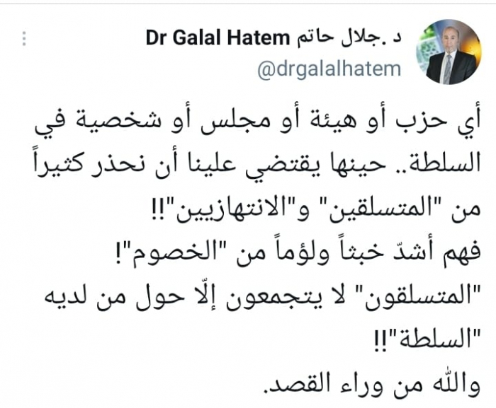 وقال في تغريدة على حسابه بموقع التدوين المصغر تويتر، اليوم إن: "أي حزب أو هيئة أو مجلس أو شخصية في السلطة.. حينها يقتضي علينا أن نحذر كثيرا من (المتسلقين) و(الانتهازيين)!!".