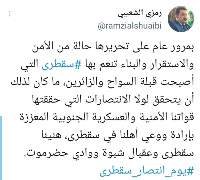وقال في تغريدة على حسابه بموقع التدوين المصغر تويتر، اليوم إنه: "بمرور عام على تحريرها حالة من الأمن والاستقرار والبناء تنعم بها سقطرى التي أصبحت قبلة السواح والزائرين".