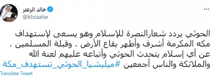 وقال في تغريدة عبر "تويتر" رصدها "المشهد العربي": "الحوثي يردد شعار النصرة للإسلام وهو يسعى لاستهداف مكه المكرمة أشرف وأطهر بقاع الأرض ، وقبلة المسلمين".