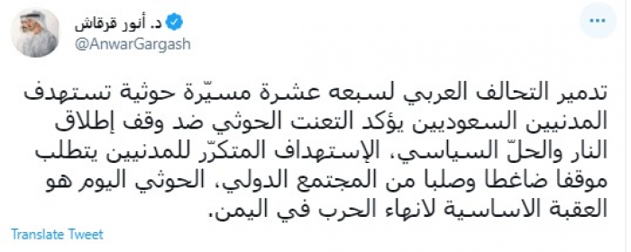 علق المستشار الدبلوماسي للرئيس الإماراتي الدكتور أنور قرقاش، اليوم، على اعتراض التحالف العربي 17 طائرة مفخخة أطلقتها مليشيات الحوثي الإرهابية تجاه المملكة.