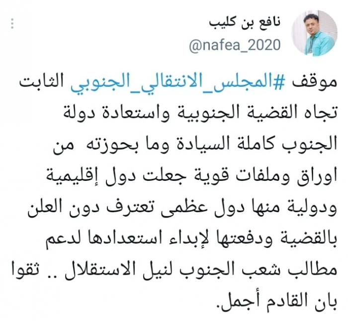 شدد الناشط السياسي نافع بن كليب، على ثبات موقف المجلس الانتقالي الجنوبي من قضية استعادة دولة الجنوب، مؤكدا أنه نجح في انتزاع اعتراف دول كبرى ودعمها.