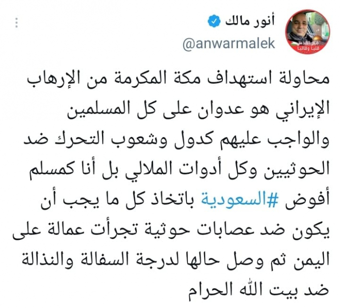 أكد الكاتب والباحث أنور مالك أن استهداف مليشيا الحوثي الإرهابية، مكة المكرمة، يعد اعتداء على جميع المسلمين، مشيرا إلى تفويضه السعودية لردع إرهاب نظام ملالي طهران وأدواته.