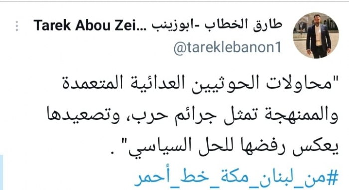 وقال في تغريدة على حسابه بموقع التدوين المصغر تويتر، اليوم إن: "محاولات الحوثيين العدائية المتعمدة والممنهجة تمثل جرائم حرب، وتصعيدها يعكس رفضها للحل السياسي"، مختتما بهاشتاج: "من لبنان مكة خط أحمر".
