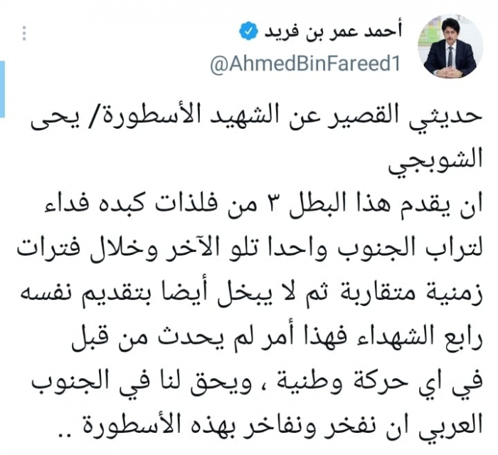 وقال في تغريدة على حسابه بموقع التدوين المصغر تويتر، اليوم إن: "حديثي القصير عن الشهيد الأسطورة يحيى الشوبجي أن يقدم هذا البطل 3 من فلذات كبده فداء لتراب الجنوب واحدا تلو الآخر وخلال فترات زمنية متقاربة ثم لا يبخل أيضا بتقديم نفسه رابع الشهداء فهذا أمر لم يحدث من قبل في أي حركة وطنية".