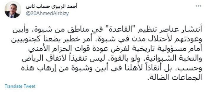 وقال في تغريدة عبر "تويتر" رصدها "المشهد العربي": "انتشار عناصر تنظيم القاعدة في مناطق من شبوة، وأبين وعودتهم لاحتلال مدن في شبوة، أمر خطير يضعنا كجنوبيين أمام مسؤولية تاريخية لفرض عودة قوات الحزام الأمني والنخبة الشبوانية، ولو بالقوة".
