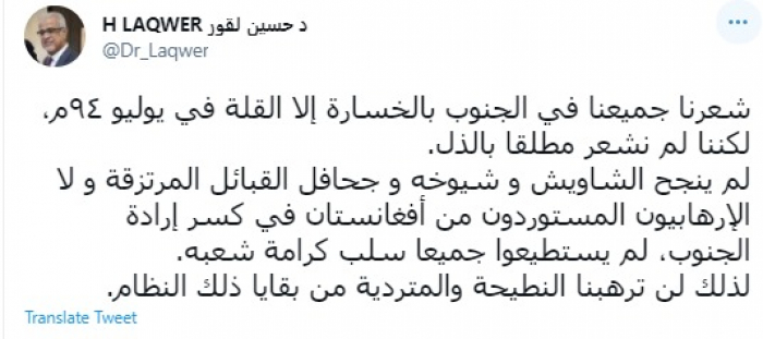 وكتب في تغريدة عبر "تويتر" رصدها "المشهد العربي": "شعرنا جميعنا في الجنوب بالخسارة إلا القلة في يوليو 94م، لكننا لم نشعر مطلقًا بالذل".