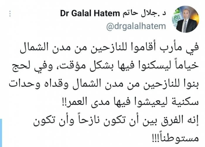 حذر الأكاديمي الجنوبي جلال حاتم، رئيس جامعة أم القيوين، من بناء مدن للنازحين إلى لحج للسكن الدائم، بينما يعيشون في خيام داخل مأرب.