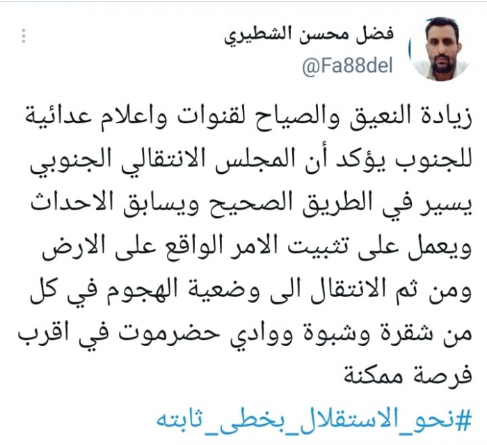 وشدد على أنه: "يسابق الأحداث ويعمل على تثبيت الأمر الواقع على الأرض ومن ثم الانتقال إلى وضعية الهجوم في كل من شقرة وشبوة ووادي حضرموت في أقرب فرصة ممكنة"، مختتما بهاشتاج "نحو الاستقلال بخطى ثابتة".