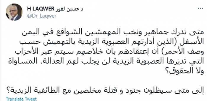 وقال في تغريدة عبر "تويتر" رصدها "المشهد العربي": "متى تدرك جماهير ونخب المهمشين الشوافع في اليمن الأسفل (الذين أدارتهم العصبوية الزيدية بالتهميش حسب وصف الأحمر) أن اعتقادهم بأن خلاصهم سيتم عبر الأحزاب التي تديرها العصبوية الزيدية لن يجلب لهم العدالة، المساواة ولا الحقوق؟".