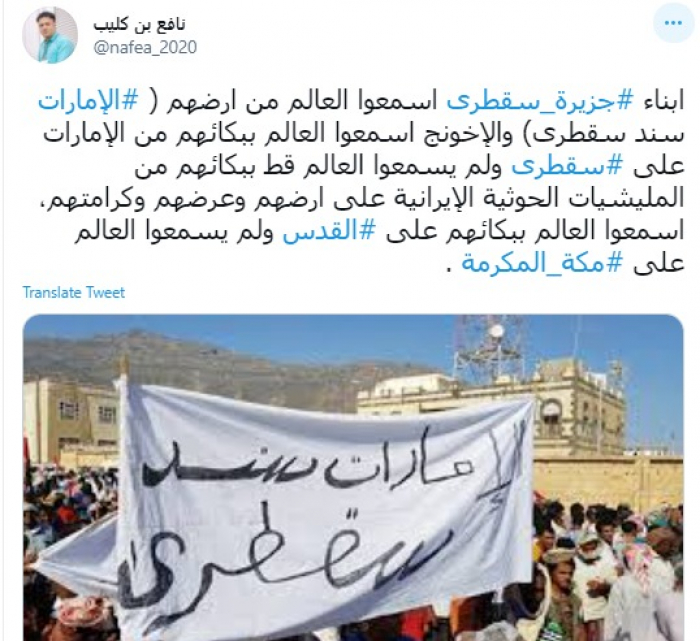 وكتب في تغريدة عبر "تويتر" رصدها "المشهد العربي": "أبناء جزيرة سقطرى أسمعوا العالم من أرضهم (الإمارات سند سقطرى) والإخونج أسمعوا العالم ببكائهم من الإمارات على سقطرى".