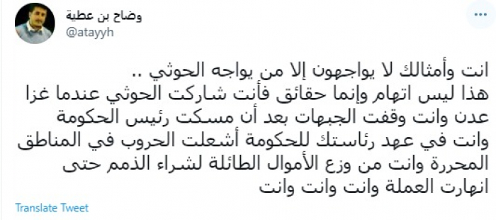 وقال في تغريدة عبر "تويتر" رصدها "المشهد العربي": "أنت وأمثالك لا يواجهون إلا من يواجه الحوثي".