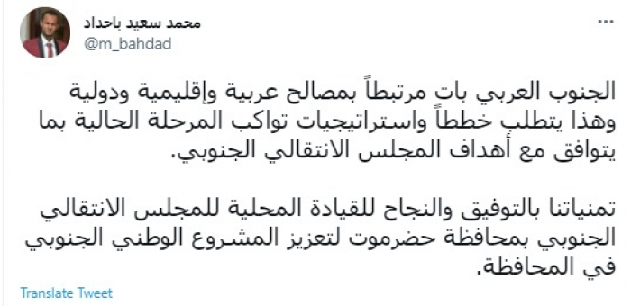 وقال في تغريدة عبر "تويتر" رصدها "المشهد العربي": "الجنوب العربي بات مرتبطًا بمصالح عربية وإقليمية ودولية وهذا يتطلب خططًا واستراتيجيات تواكب المرحلة الحالية بما يتوافق مع أهداف المجلس الانتقالي الجنوبي".