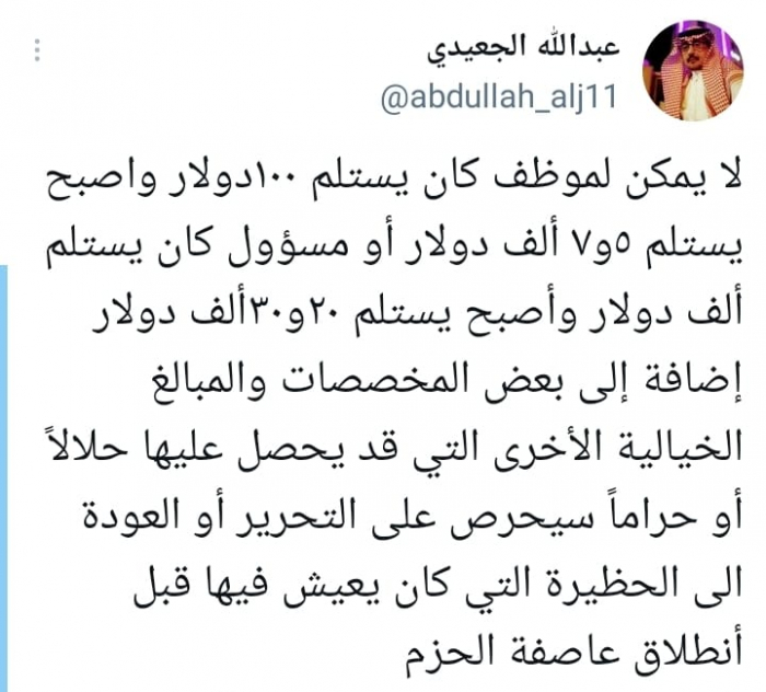وأشار في تغريدة على حسابه بموقع التدوين المصغر تويتر، اليوم إلى أنه: "لا يمكن لموظف كان يستلم 100 دولار وأصبح يستلم 5 و7 ألاف دولار أو مسؤول كان يستلم ألف دولار وأصبح يستلم 20 و30 ألف دولار".