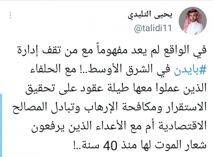 وشدد في تغريدة على حسابه بموقع التدوين المصغر تويتر، اليوم على أنه: "في الواقع لم يعد مفهوماً مع من تقف إدارة بايدن في الشرق الأوسط..!".