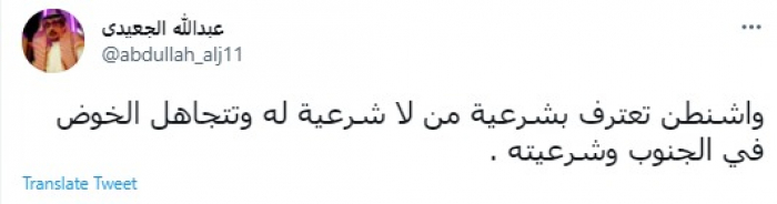 وقال في تغريدة عبر "تويتر" رصدها "المشهد العربي": "واشنطن تعترف بشرعية من لا شرعية له وتتجاهل الخوض في الجنوب وشرعيته".