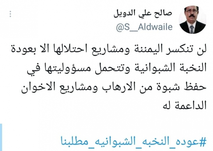 وأشار في تغريدة على حسابه بموقع التدوين المصغر تويتر، اليوم إلى أنه: "لن تنكسر اليمننة ومشاريع احتلالها إلا بعودة النخبة الشبوانية وتتحمل مسؤوليتها في حفظ شبوة من الإرهاب ومشاريع الإخوان الداعمة له"، مضيفا: "عودة النخبة الشبوانية مطلبنا".