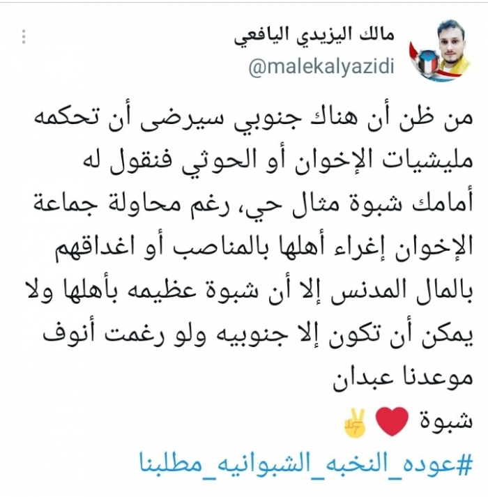 وأوضح أنها: "رغم محاولة جماعة الإخوان إغراء أهلها بالمناصب أو إغداقهم بالمال المدنس إلا أن شبوة عظيمة بأهلها ولا يمكن أن تكون إلا جنوبية ولو رغمت أنوف، موعدنا عبدان شبوة"، مختتما بهاشتاج: "عودة النخبة الشبوانية مطلبنا".