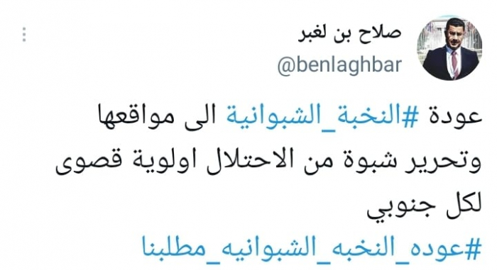 وأكد في تغريدة على حسابه بموقع التدوين المصغر تويتر، اليوم الجمعة، أن: "عودة النخبة الشبوانية إلى مواقعها وتحرير شبوة من الاحتلال أولوية قصوى لكل جنوبي"، مختتما: "عودة النخبة الشبوانية مطلبنا".