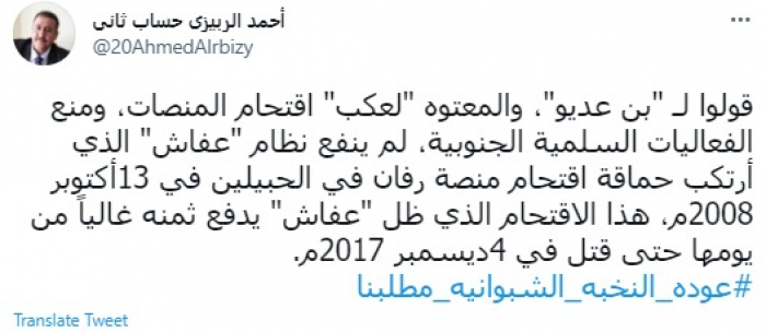 وقال في تغريدة عبر "تويتر" رصدها "المشهد العربي": "قولوا لبن عديو، والمعتوه لعكب اقتحام المنصات، ومنع الفعاليات السلمية الجنوبية، لم ينفع نظام عفاش الذي ارتكب حماقة اقتحام منصة ردفان في الحبيلين في 13أكتوبر 2008م".