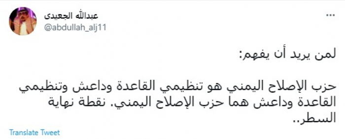 وقال في تغريدة عبر "تويتر" رصدها "المشهد العربي": "لمن يريد أن يفهم: حزب الإصلاح اليمني هو تنظيمي القاعدة وداعش وتنظيمي القاعدة وداعش هما حزب الإصلاح اليمني. نقطة نهاية السطر".